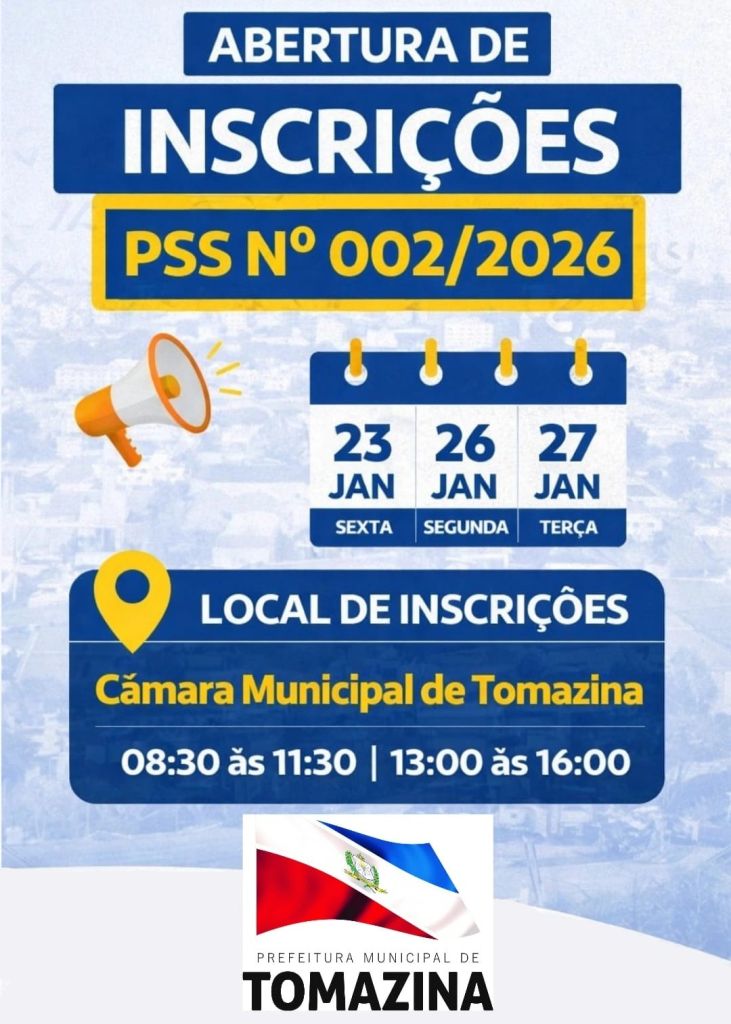 A Prefeitura Municipal de Tomazina informa à população que o Processo Seletivo Simplificado – PSS nº 001/2026 foi revogado, conforme decisão administrativa, e que, na sequência, foi publicado o Edital do Processo Seletivo Simplificado nº 002/2026, destinado à contratação temporária de profissionais para atender às necessidades do serviço público municipal.